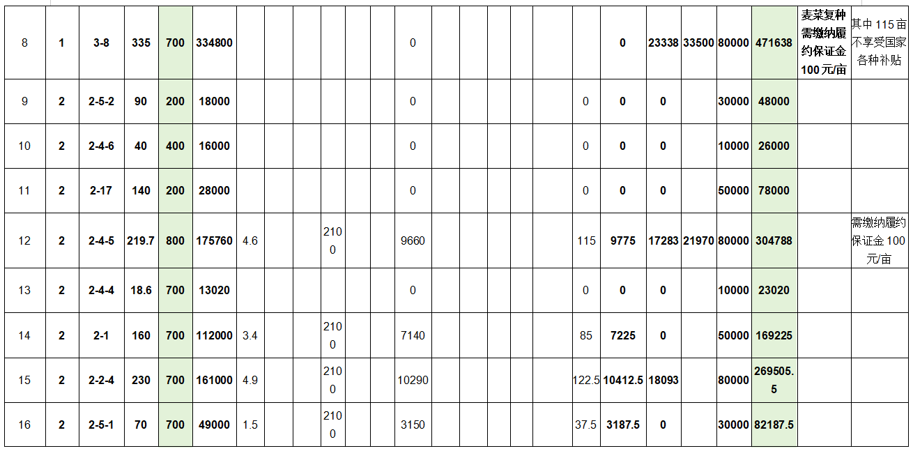 4、序號(hào)8、序號(hào)25地塊為麥菜復(fù)種,地塊收取履約保證金100元/畝,待青苗出齊驗(yàn)收合格給與返還;序號(hào)8麥菜復(fù)種地塊,其中115畝為基本田統(tǒng)一流轉(zhuǎn),不享受國家各種補(bǔ)貼,北側(cè)200米由于地勢原因,易產(chǎn)生內(nèi)澇,可以種植其他作物。