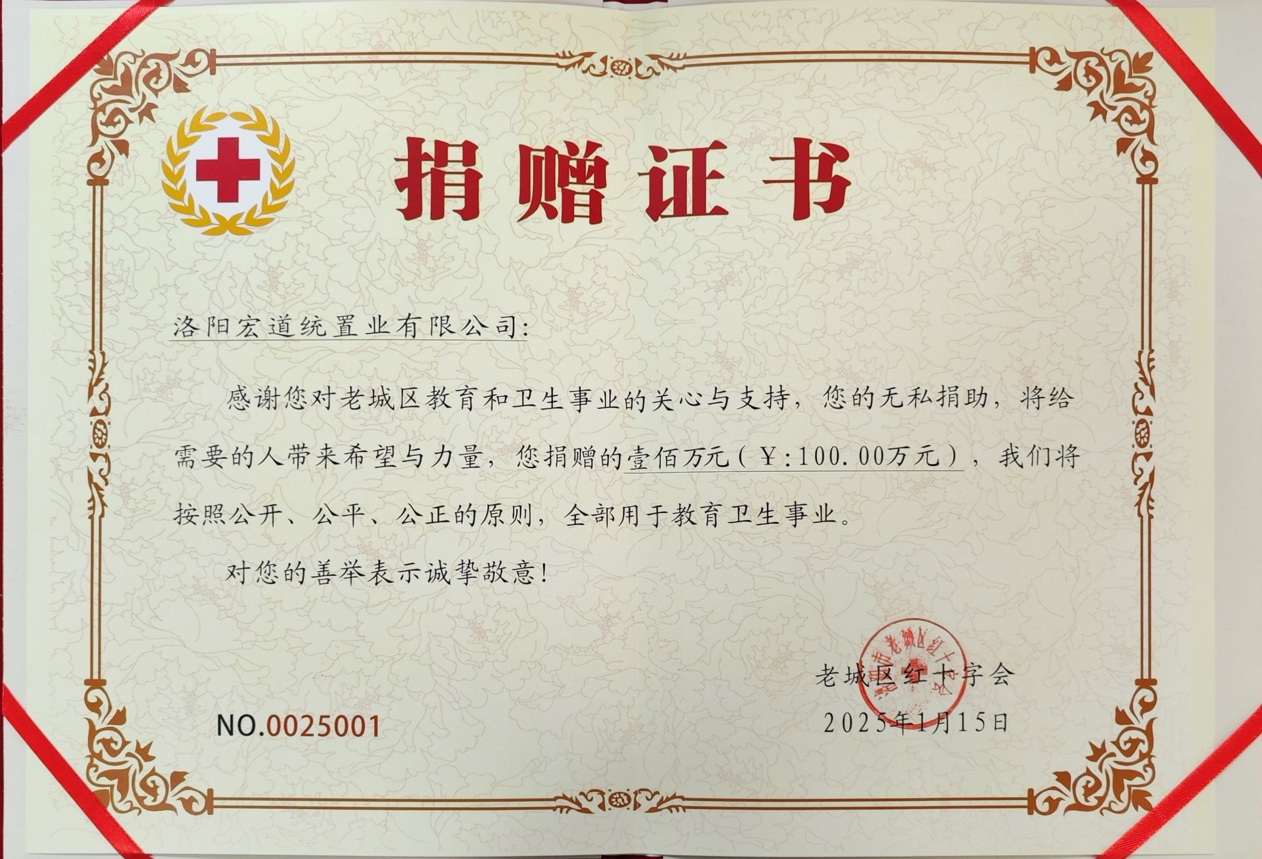 【概要描述】2025年1月15日,在助力地方社會(huì)事業(yè)發(fā)展的征程中,美倫集團(tuán)再次彰顯擔(dān)當(dāng)。以全資子公司宏道統(tǒng)置業(yè)公司名義向老城區(qū)教育和衛(wèi)生事業(yè)慷慨捐款100萬元。此次義舉,得到了廣泛贊譽(yù),“老城區(qū)紅十字會(huì)”特為公司頒發(fā)捐贈(zèng)證書,表彰其愛心奉獻(xiàn)。